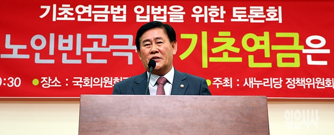 18일, 새누리당 정책위와 보건복지위 주최로 '기초연금법 입법을 위한 토론회'가 서울 여의도 국회 의원회관에서 열린 가운데, 최경환 원내대표가 모두발언하고 있다.