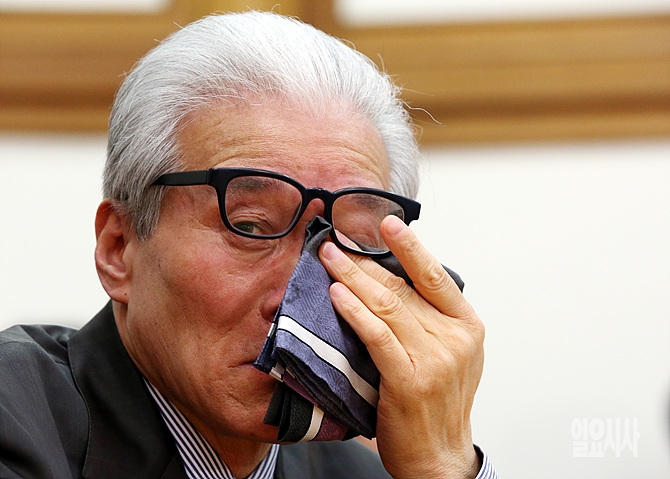 18일, 새누리당 정책위와 보건복지위 주최로 '기초연금법 입법을 위한 토론회'가 서울 여의도 국회 의원회관에서 열리고 있는 가운데, 한 참석자가 눈시울을 붉히고 있다.
