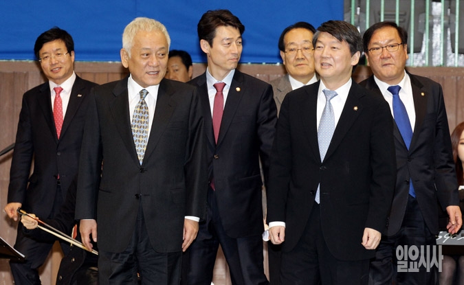 김한길, 안철수 새정치민주연합 공동창당준비위원장이 18일 경기도 수원실내체육관에서 열린 새정치민주연합 경기도당 창당대회에 참석하고 있다.