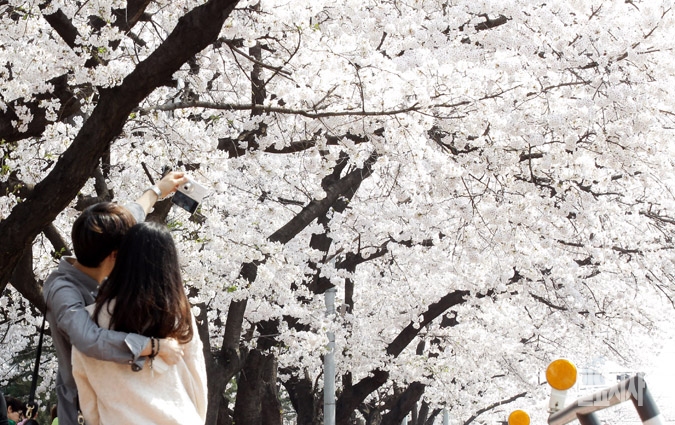 한강 여의도 봄꽃축제를 하루 앞둔 2일 서울 여의도 윤중로를 찾은 시민들이 활짝 핀 벚꽃의 정취를 만끽하고 있다.