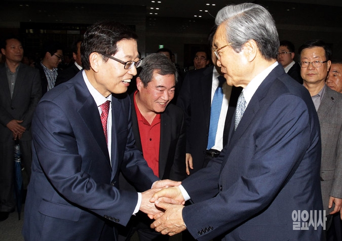 김황식 새누리당 서울시장 예비후보(왼쪽)가 3일 서울 여의도 중소기업중앙회에서 열린 출정식에서 이한동 전 총리와 인사를 나누고 있다.