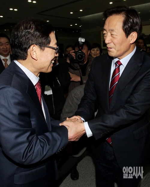 김황식 새누리당 서울시장 예비후보(왼쪽)가 3일 서울 여의도 중소기업중앙회에서 열린 출정식에서 정몽준 예비후보와 인사를 나누고 있다.