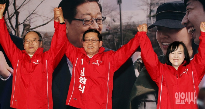 김황식 새누리당 서울시장 예비후보(가운데)가 3일 서울 여의도 중소기업중앙회에서 열린 출정식에서 정성진(왼쪽), 심화진 공동선대위원장과 함께 손을 들어 참석자들에게 인사하고 있다.