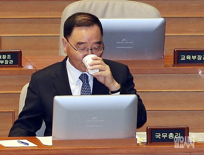 정홍원 국무총리가 3일 오후 서울 여의도 국회에서 열린 323차 국회(임시회) 3차 본회의 정치 부문 대정부 질문에 참석 도중 물을 들이키고 있다.