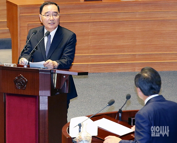 정홍원 국무총리가 3일 오후 서울 여의도 국회에서 열린 323차 국회(임시회) 3차 본회의 정치 부문 대정부 질문에서 새누리당 이군현 의원의 질의에 답변하고 있다.