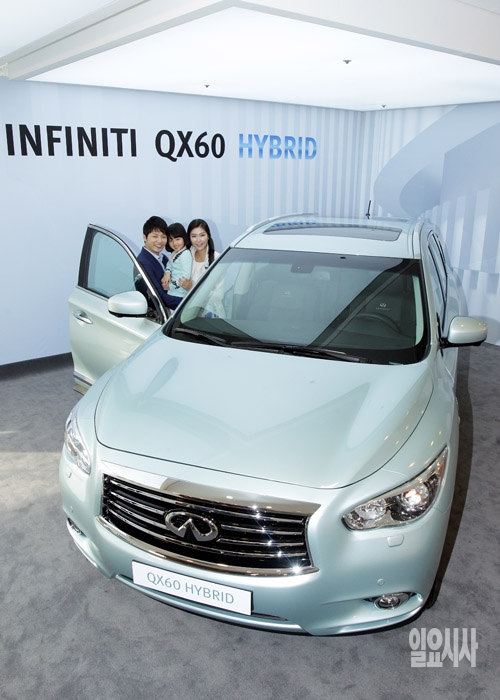 인피니티가 7일 서울 서초동 인피니티 서초 전시장에서 7인승 럭셔리 크로스오버 '인피니티 QX60 하이브리드'를 선보이고 있다. 국내 최초 7인승 하이브리드 모델인 QX60은 기존 가솔린 모델(2013년형) 대비 30% 이상 향상된 복합연비, 최상의 안락함을 제공하는 넉넉한 실내 공간, 부드러운 주행성능과 정숙성 등 다양한 매력을 제공하며 더불어, 2.5리터 QR25 수퍼 차저 엔진(233ps) 및 15kw(20ps) 전기모터를 조합해 최고출력 253ps의 강력한 성능을 자랑한다.
