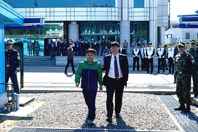 지난 4일, 남해 공해상에서 침몰한 화물선에 타고 있던 북한 선원 가운데 구조된 선원이 전날(6일), 판문점을 통해 북한으로 송환되고 있다. (사진공동취재단)