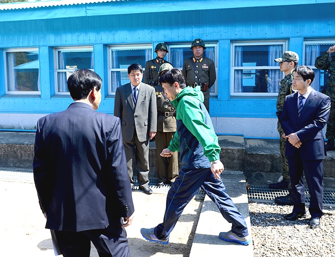지난 4일, 남해 공해상에서 침몰한 화물선에 타고 있던 북한 선원 가운데 구조된 선원이 전날(6일), 판문점을 통해 북한으로 송환되고 있다. (사진공동취재단)