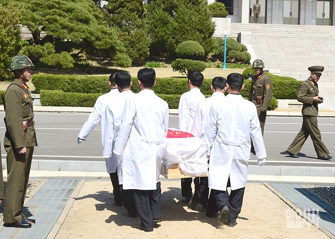지난 4일, 남해 공해상 화물선 침몰 사고의 선원 시신이 전날(6일), 판문점을 통해 북한으로 송환되고 있다. (사진공동취재단)