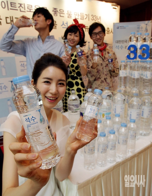하이트진로음료가 7일 서울 중구 세종호텔에서 '석수' 리뉴얼 제품을 출시하고 있다. 소백산맥을 모티브로 한 고급스러운 디자인과 최신 안전 설비와 시스템을 통해 향상된 품질로 리뉴얼 출시된 '석수'는 1982년 출시된 국내 대표 먹는샘물 제품으로 세계 3대 광천수 지역인 충북 청원군 소백산맥 지하 200m 천연 암반수를 사용했다.