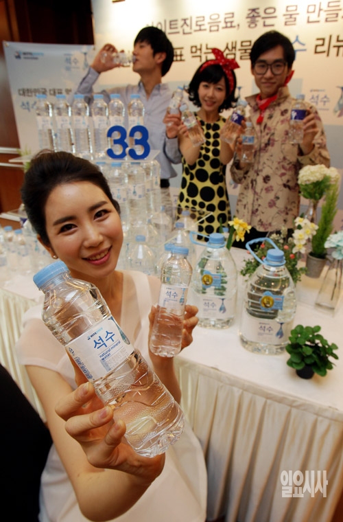 하이트진로음료가 7일 서울 중구 세종호텔에서 '석수' 리뉴얼 제품을 출시하고 있다. 소백산맥을 모티브로 한 고급스러운 디자인과 최신 안전 설비와 시스템을 통해 향상된 품질로 리뉴얼 출시된 '석수'는 1982년 출시된 국내 대표 먹는샘물 제품으로 세계 3대 광천수 지역인 충북 청원군 소백산맥 지하 200m 천연 암반수를 사용했다.