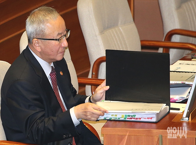 7일 오전, 서울 여의도 국회에서 열린 국회 사흘째 대정부질문에 현오석 경제부총리 겸 기획재정부 장관이 출석해 답변자료를 살피고 있다.