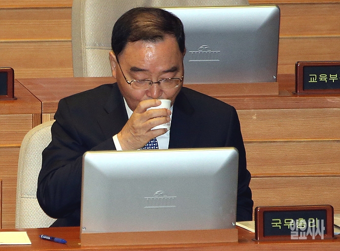 7일 오전, 서울 여의도 국회에서 열린 국회 사흘째 대정부질문 도중 정홍원 국무총리가 목이 타는 듯 물을 들이키고 있다.