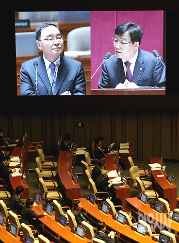 7일 오전, 서울 여의도 국회에서 열린 국회 사흘째 대정부질문에서 새누리당 이종진 의원이 정홍원 국무총리에게 질의하고 있다.