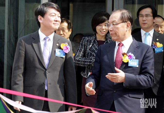 황우여 새누리당 대표와 안철수 새정치민주연합 공동대표가 7일 서울 마포구 상암동 YTN 뉴스퀘어에서 열린 NEW YTN 출범식에 참석, 대화를 하며 테이프 컷팅 장소로 이동하고 있다.