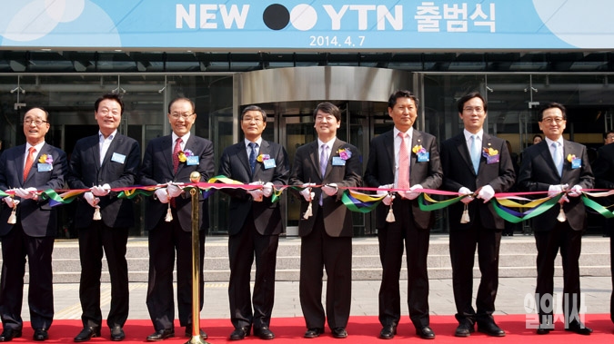 황우여 새누리당 대표(왼쪽 세번째부터), 배석규 YTN 사장, 안철수 새정치민주연합 공동대표를 비롯한 참석자들이 7일 서울 마포구 상암동 YTN 뉴스퀘어에서 열린 NEW YTN 출범식에 참석, 테이프 컷팅을 하고 있다.
