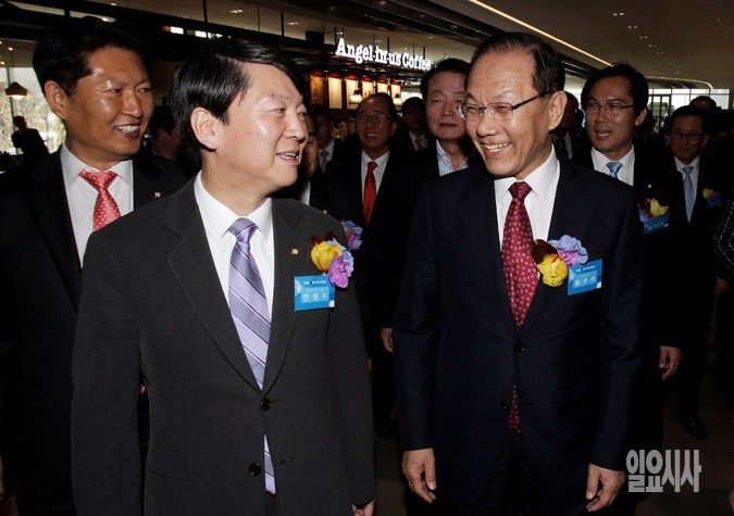 황우여 새누리당 대표(오른쪽)와 안철수 새정치민주연합 공동대표가 7일 서울 마포구 상암동 YTN 뉴스퀘어에서 열린 NEW YTN 출범식에 참석하고 있다.