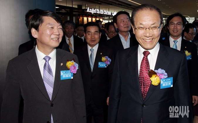 황우여 새누리당 대표(오른쪽)와 안철수 새정치민주연합 공동대표가 7일 서울 마포구 상암동 YTN 뉴스퀘어에서 열린 NEW YTN 출범식에 참석하고 있다.
