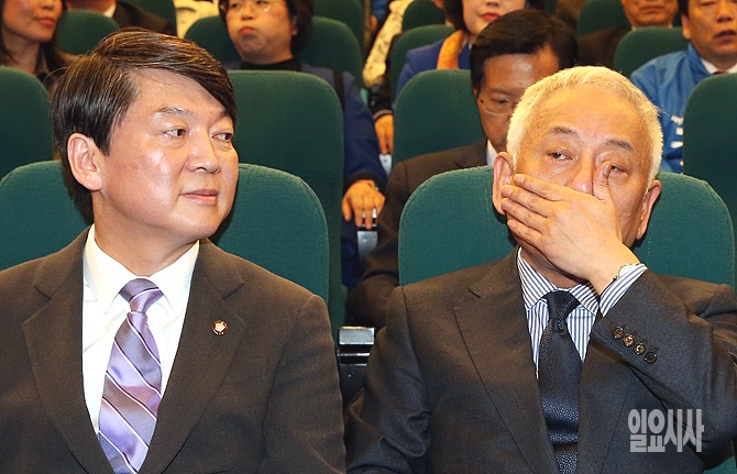 김한길(사진 오른쪽)·안철수 새정치민주연합 공동대표가 7일 오후, 서울 여의도 국회에서 열린 기초선거 정당공천폐지 입법 관철을 위한 결의대회에서 묘한 표정을 하고 있다.