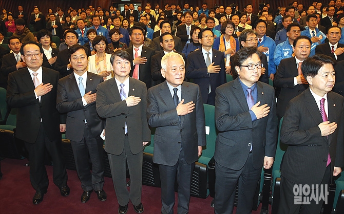 김한길·안철수 새정치민주연합 공동대표 등이 7일 오후, 서울 여의도 국회에서 열린 기초선거 정당공천폐지 입법 관철을 위한 결의대회 직전 국기에 대한 경례를 하고 있다.