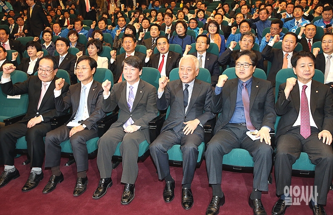 김한길·안철수 새정치민주연합 공동대표 등이 7일 오후, 서울 여의도 국회에서 열린 기초선거 정당공천폐지 입법 관철을 위한 결의대회에서 파이팅을 외치고 있다.