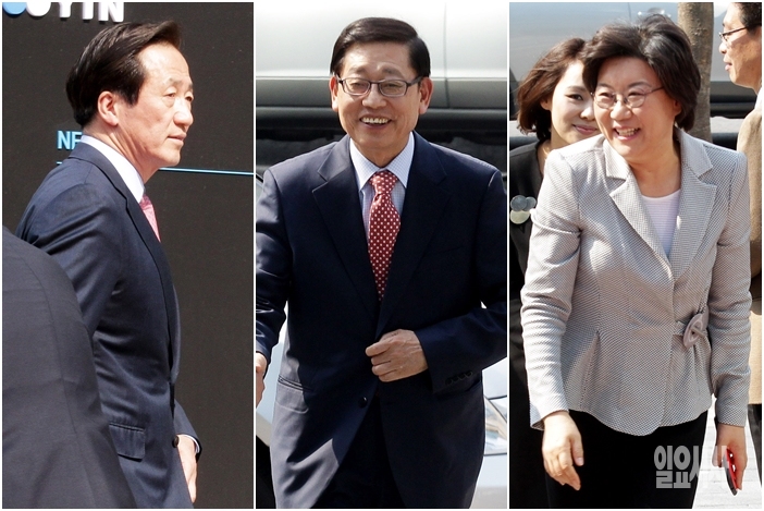정몽준(왼쪽부터), 김황식, 이혜훈 새누리당 서울시장 예비후보가 7일 서울 마포구 상암동 YTN 뉴스퀘어에서 열린 NEW YTN 출범식에 참석하고 있다.