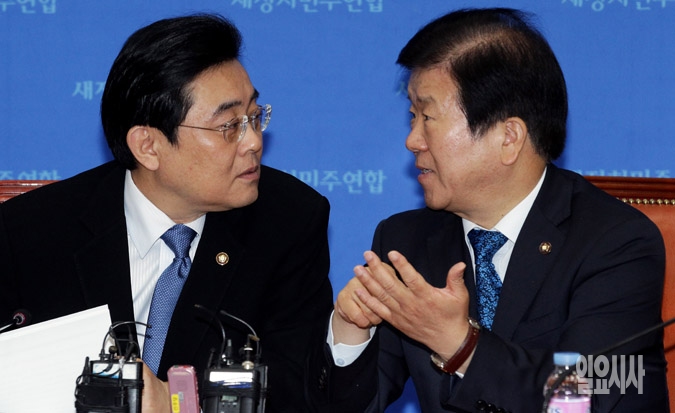 전병헌 새정치민주연합 원내대표(왼쪽)가 8일 서울 여의도 국회에서 열린 원내대책회의에서 박병석 국회부의장과 이야기를 나누고 있다.