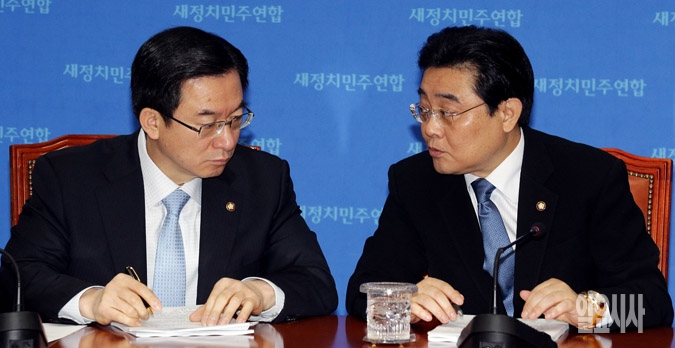 전병헌 새정치민주연합 원내대표(오른쪽)가 8일 서울 여의도 국회에서 열린 원내대책회의에서 정성호 원내수석부대표와 이야기를 나누고 있다.