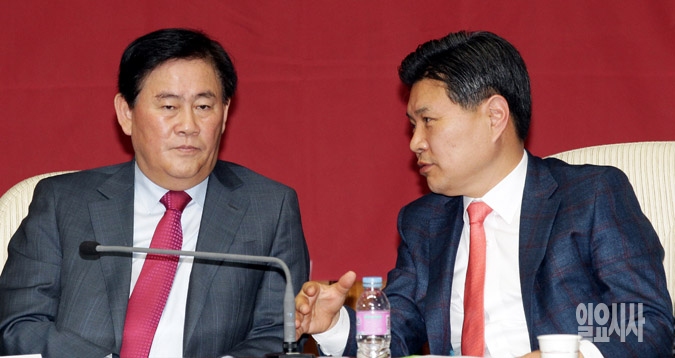 8일 서울 여의도 국회에서 열린 새누리당 원내대책회의에서 최경환 원내대표(왼쪽)와 홍문종 사무총장이 대화를 하고 있다.