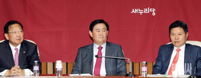 8일 서울 여의도 국회에서 열린 새누리당 원내대책회의에서 최경환 원내대표를 비롯한 참석자들이 동료의원들의 발언을 경청하고 있다. 사진 왼쪽부터 유일호 정책위의장, 최 원내대표, 홍문종 사무총장.