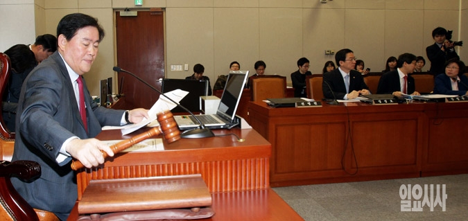 최경환 국회 운영위원장이 8일 서울 여의도 국회에서 열린 운영위 전체회의에서 의안을 상정하고 있다. 이날 국회 운영위는 국회의원 배지와 국회기 문양을 한글화하는 내용의 '국회기 및 국회배지 등에 관한 규칙 일부개정규칙안'을 통과시켰다.