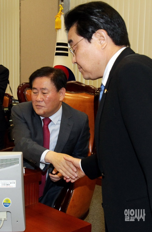 최경환 국회 운영위원장(왼쪽)이 8일 서울 여의도 국회에서 열린 운영위 전체회의에서 전병헌 새정치민주연합 원내대표와 인사를 나누고 있다.