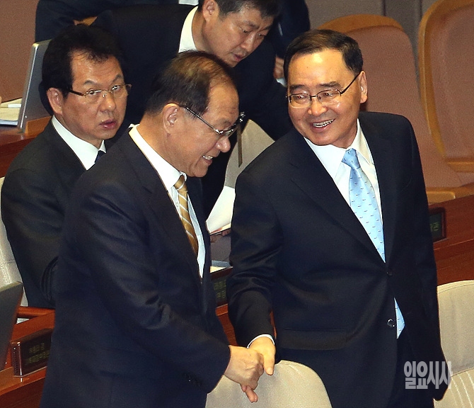 8일, 서울 여의도 국회 본회의장에서 교육·사회·문화 분야 대정부질문이 나흘 째 열린 가운데, 대정부질문 직후 정홍원 국무총리와 황우여 새누리당 대표가 악수를 나누고 있다.