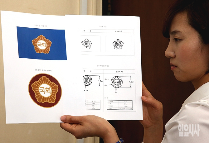 8일, 서울 여의도 국회에서 한 국회 사무처 관계자가 새로 디자인된 한글 국회의원 배지 시안을 들어보이고 있다. 한글화된 배지는 오는 16일 본회의를 통과하는대로 시행될 예정이다.