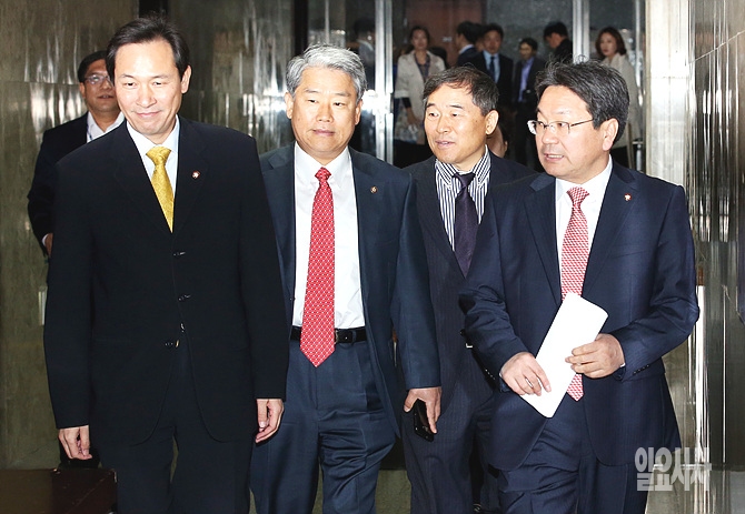 8일, 새정치민주연합 우상호·김동철·황주홍·강기정 의원이 서울 여의도 국회에서 열린 새정치민주연합 긴급의원총회 참석을 위해 입장하고 있다.