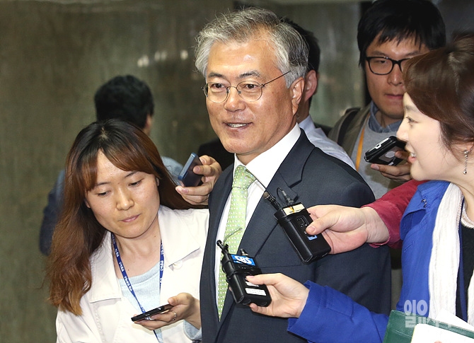8일, 새정치민주연합 문재인 의원이 서울 여의도 국회에서 열린 새정치민주연합 긴급의원총회 참석을 위해 입장하던 도중 취재진의 질문에 답변하고 있다.