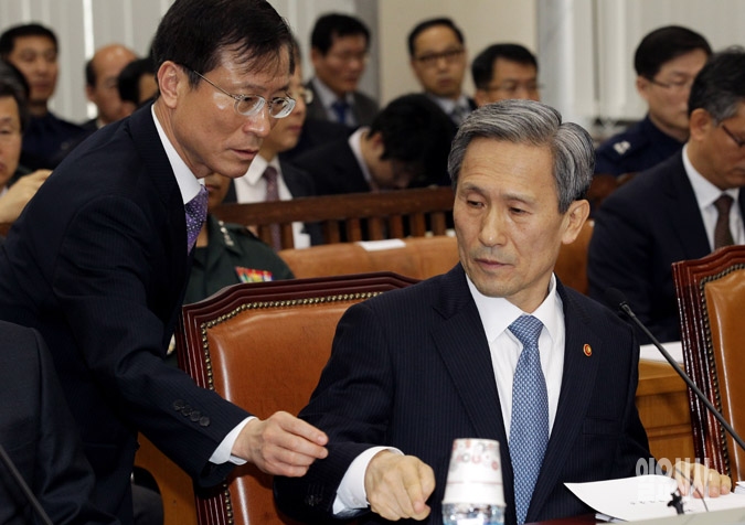 김관진 국방부 장관이 9일 서울 여의도 국회에서 열린 국방위원회 전체회의에서 관계자와 무인정찰기 관련 현안보고 준비를 하고 있다.