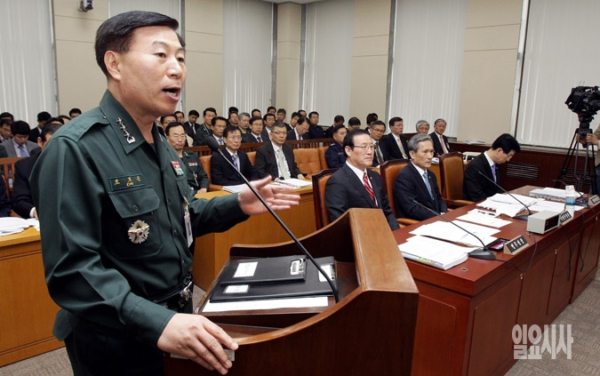 조보근 국방부 정보본부장이 9일 서울 여의도 국회에서 열린 국방위원회 전체회의에서 의원들의 북한 무인정찰기 관련 질의에 답하고 있다.