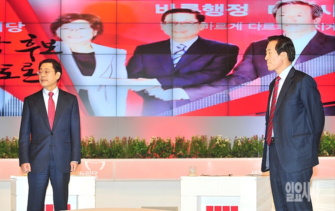 9일 오후, 서울 여의도 MBC 사옥에서 새누리당 김황식(사진 왼쪽)·정몽준 6·4지방선거 서울시장 후보가 TV토론회 직전 한 자리에 서 있다.