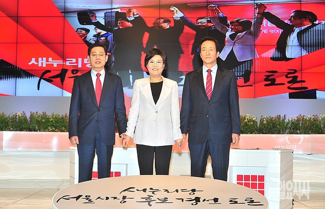 9일 오후, 서울 여의도 MBC 사옥에서 새누리당 김황식·이혜훈·정몽준(사진 왼쪽부터) 6·4지방선거 서울시장 후보들이 TV토론회 직전, 기념촬영을 하고 있다.