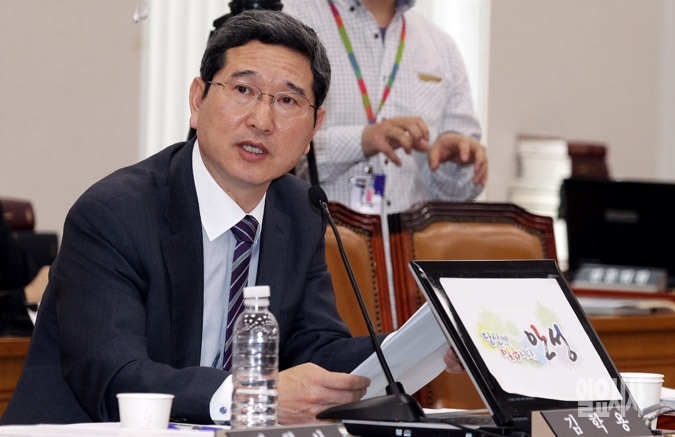 김학용 새누리당 의원이 9일 서울 여의도 국회에서 열린 법제사법위원회 전체회의에서 박병대 법원행정처장에게 질의를 하고 있다.