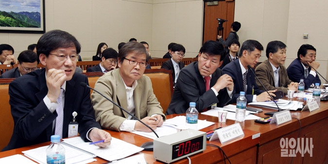 9일 서울 여의도 국회 환경노동위원회에서 열린 '근로시간 단축 관련 공청회'에서 정부측 진술인인 임무송 고용노동부 근로개선정책관(맨 왼쪽)이 의원들의 질의에 답하고 있다.