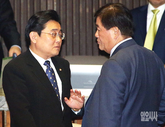 16일, 서울 여의도 국회 본회의장에서 새누리당 최경환 원내대표(사진 오른쪽)와 새정치민주연합 전병헌 원내대표가 심각한 표정으로 이야기를 나누고 있다.
