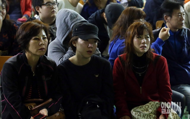 16일 오전 진도 해상에서 안산 단원고 학생 325명과 승무원 등 477명이 탑승한 여객선이 침몰한 가운데 이날 경기 안산 단원고에서 비보를 듣고 달려온 학부모들이 학생들의 구조 소식을 애타게 기다리고 있다.