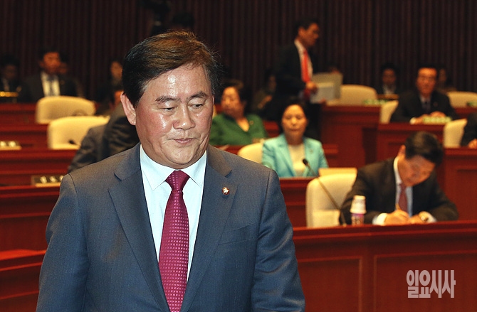 16일 오후, 이날 오전에 발생했던 진도 여객선 침몰 사건과 관련해 서울 여의도 국회에서 새누리당 긴급 의원총회가 열린 가운데, 최경환 원내대표가 수심 가득한 표정으로 자리로 이동하고 있다.