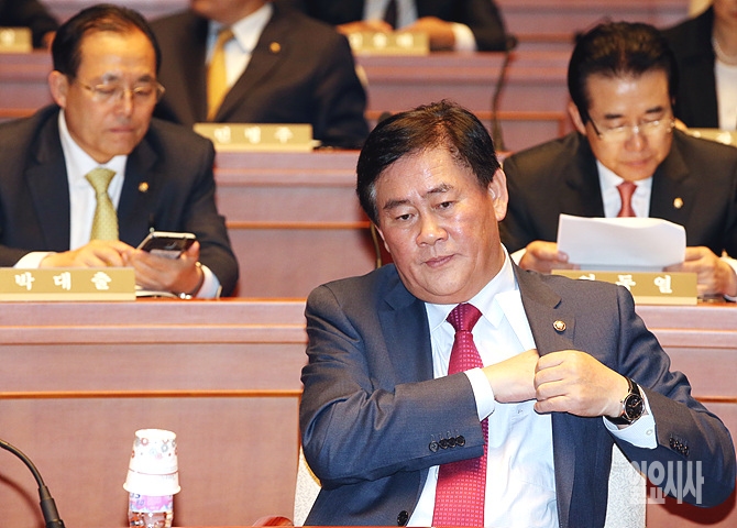 16일 오후, 이날 오전에 발생했던 진도 여객선 침몰 사건과 관련해 서울 여의도 국회에서 새누리당 긴급 의원총회가 열린 가운데, 최경환 원내대표가 착찹한 표정을 짓고 있다.