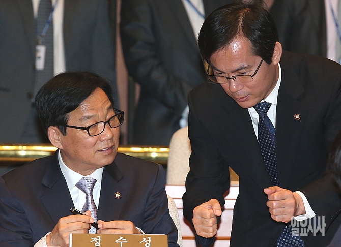 16일 오후, 이날 오전에 발생했던 진도 여객선 침몰 사건과 관련해 서울 여의도 국회에서 새누리당 긴급 의원총회가 열린 가운데, 이종진-김영우 의원(사진 오른쪽)이 이야기하고 있다.