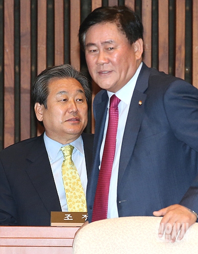 16일 오후, 이날 오전에 발생했던 진도 여객선 침몰 사건과 관련해 서울 여의도 국회에서 새누리당 긴급 의원총회가 열린 가운데, 서로 다른 표정의 최경환 원내대표와 김무성 의원이 한 앵글에 잡혔다.