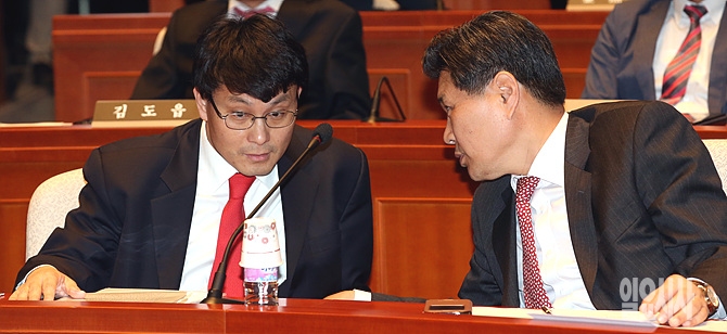 16일 오후, 이날 오전에 전남 진도에서 침몰한 여객선 관련 새누리당 긴급 의원총회가 서울 여의도 국회에서 열린 가운데, 윤상현 원내수석부대표와 홍문종 사무총장(사진 오른쪽)이 심각한 표정으로 이야기를 나누고 있다.