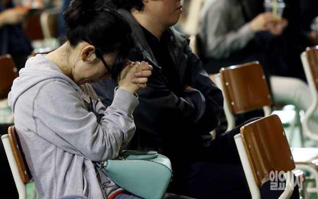 사고 여객선 세월호를 타고 수학여행을 떠난 경기 안산 단원고에서 17일 한 학부모가 학생들의 구조 소식을 애타게 기다리며 기도하고 있다.